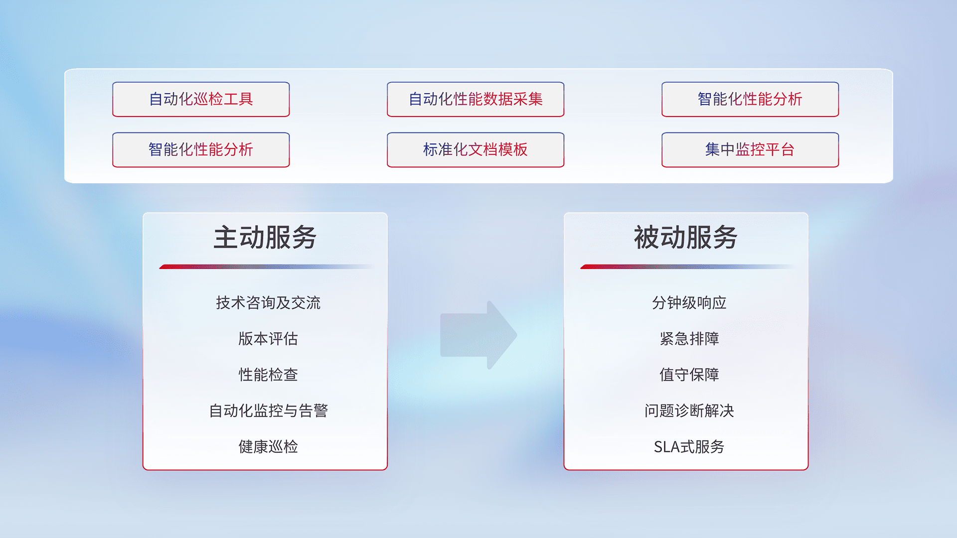 智能化工具和标准化文档,,,保障服务质量,,,,提供主动服务(包含技术咨询、、、、版本评估、、性能检查、、、自动化监控与告警、、、健康巡检)和被动服务包含(分钟级响应、、紧急排障、、值守保障、、、问题诊断解决、、、、SLA服务)。。